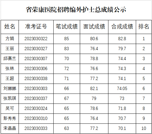 根据我院2023年招聘编外护士工作安排,经过报名、资格审查、笔试、面试等程序,现将总成绩公布如下,后续体检等有关事项另行通知。