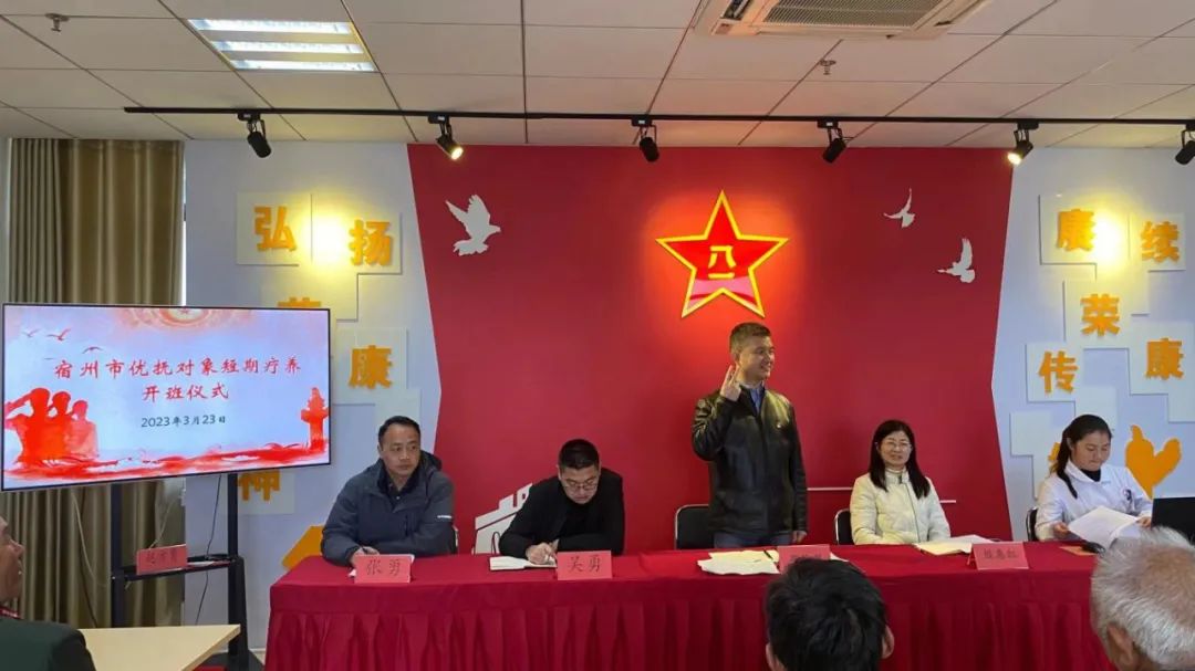 3月23日上午,来自宿州市40名优抚对象,在安徽省荣军康复医院荣军之家举行短期疗养开班仪式,医院党委书记崔俊岗、党委委员、副院长殷惠红出席仪式,荣管科、荣康二科工作人员及荣军休养中心支部全体党员参加。