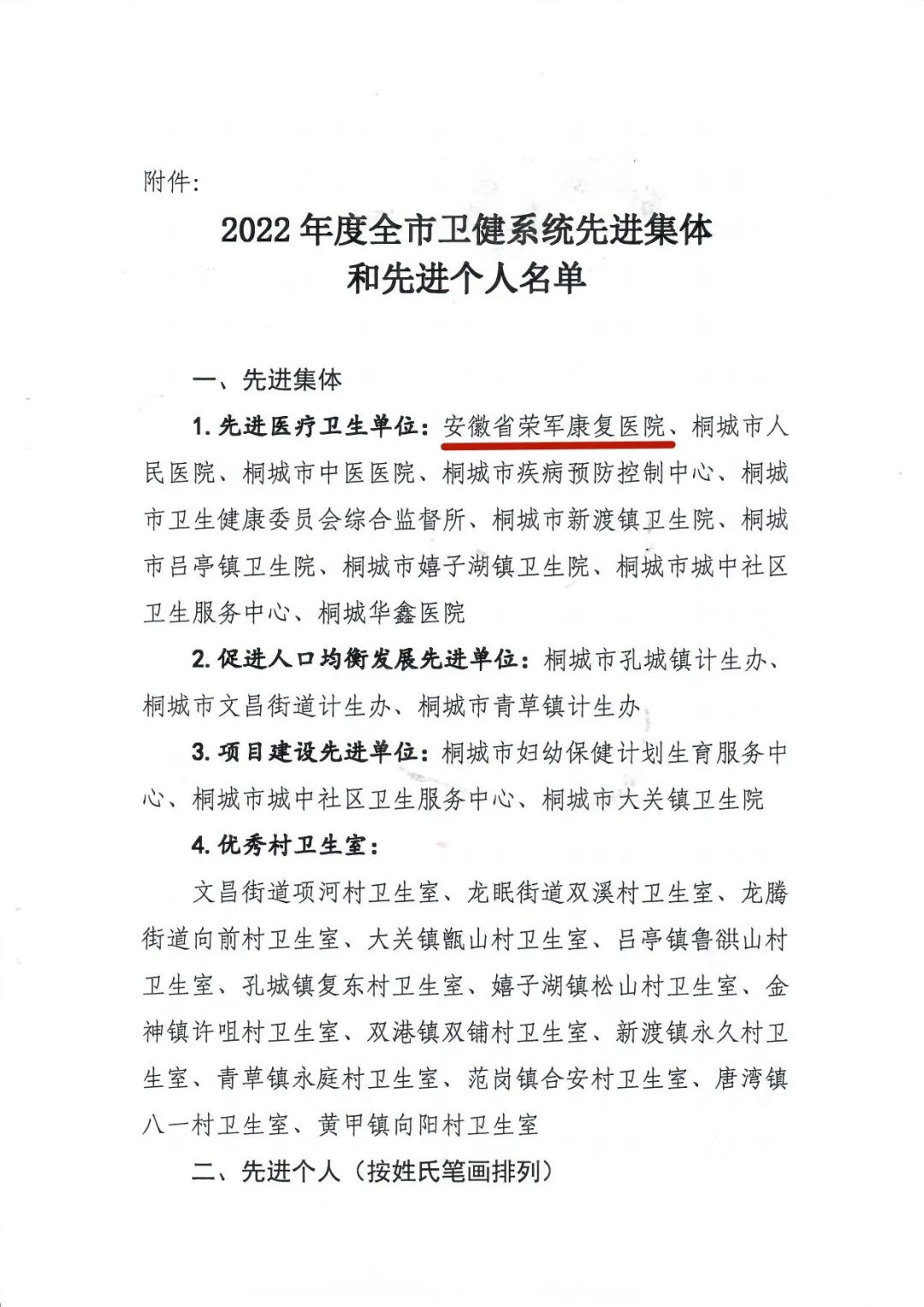 安徽省荣军康复医院被评为2022年度桐城市卫健系统先进集体!王瑞城、袁媒、程根三位职工被评为2022年度桐城市卫健系统先进个人!