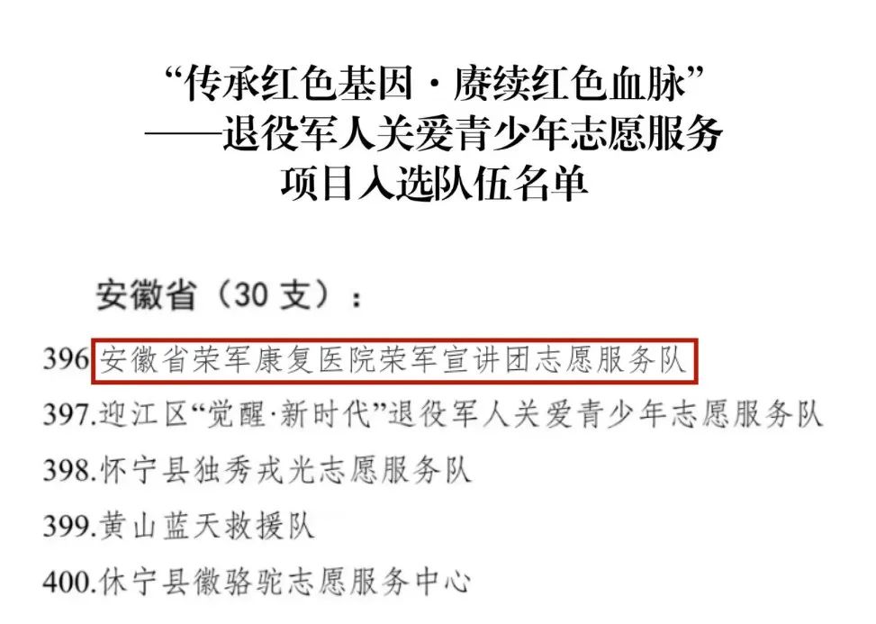 安徽省荣军康复医院荣军宣讲团志愿服务队经层层遴选、逐级审核,成功入选“传承红色基因·赓续红色血脉”——退役军人关爱青少年志愿服务项目。