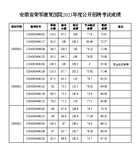 附件:安徽省荣军康复医院2023年度公开招聘考试成绩
