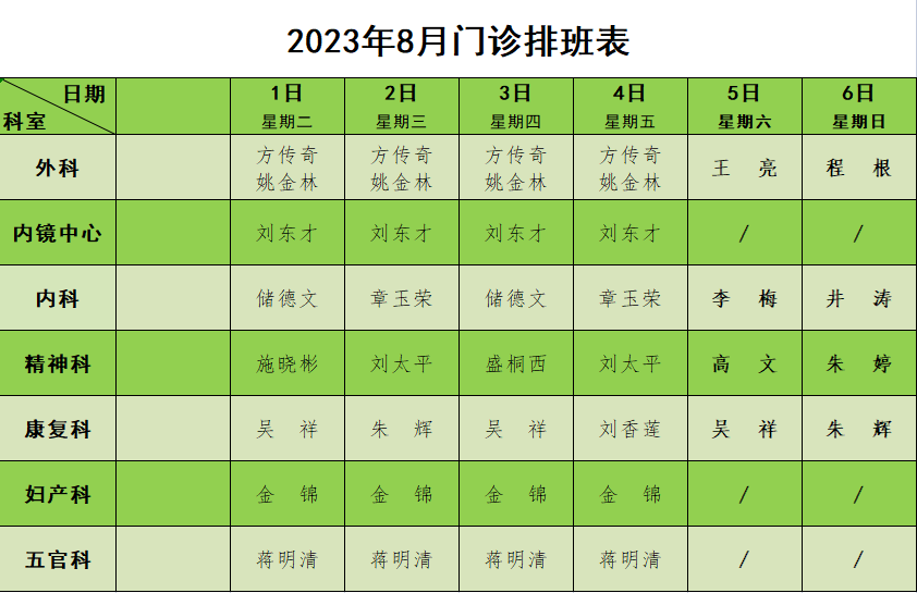 2023年8月门诊节假日排班表