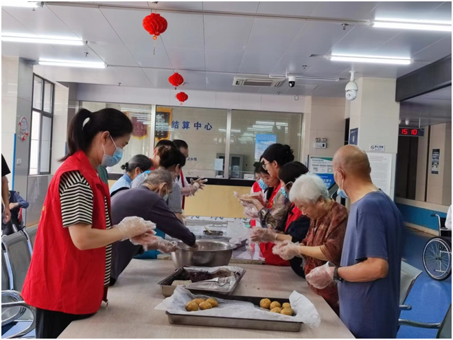 中秋活动还组织医养中心工作人员和老人共同制作中秋月饼。老人们精神抖擞地坐在桌旁,手握面团和模具,展现出干练的手法和温暖的笑容,仿佛回到了年少时奋斗过的厨房找到了自己的主场,再次感受到了烹饪的乐趣和节日的味道。