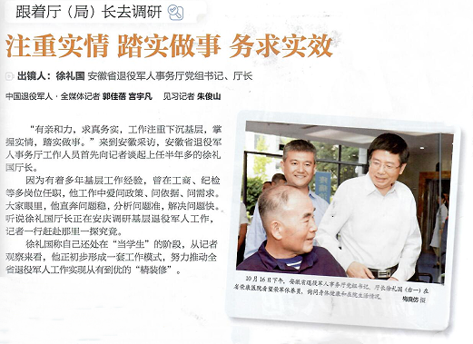 医院荣军广场上,“姓军为兵,服务社会”几个大字高高竖立在医院主楼楼顶。赶往下一个调研地点前,徐礼国不忘再次叮嘱:“姓军为兵,任重道远!我们的主业就是为优抚对象服务,要始终像对待亲人一样对待他们。我们各方要齐头并进,尽快打造出具有竞争力和影响力的优抚医院!”