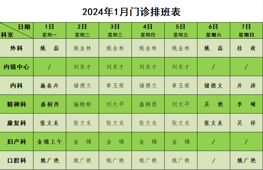 2024年1月门诊排班表