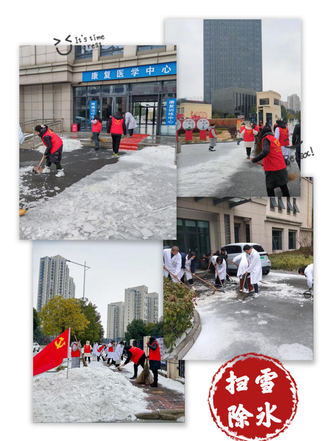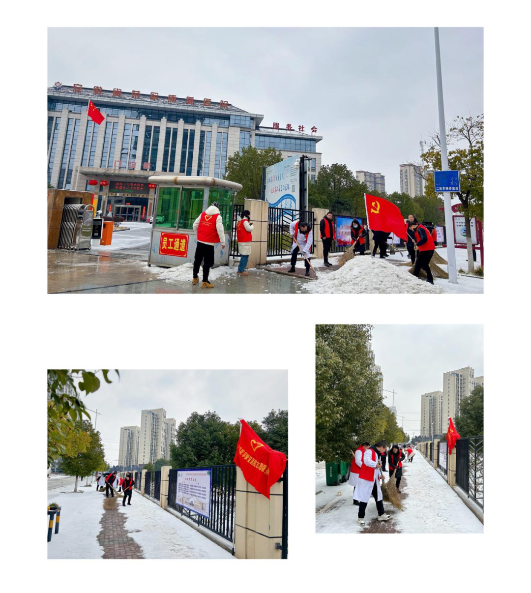 医院大门两侧主通道、门诊入口、休养楼前到处都有志愿者的身影。志愿者们手持除雪铲、铁锹、扫把,分工有序,配合默契,干的热火朝天,道路上演奏着“哐哐擦擦”的扫雪除冰“进行曲”,忙碌的身影在皑皑白雪中构成了一道靓丽的风景线。经过1个多小时的奋力清扫,院区内外各出入口开辟了安全畅通的道路,极大的方便了患者、车辆和行人通行。