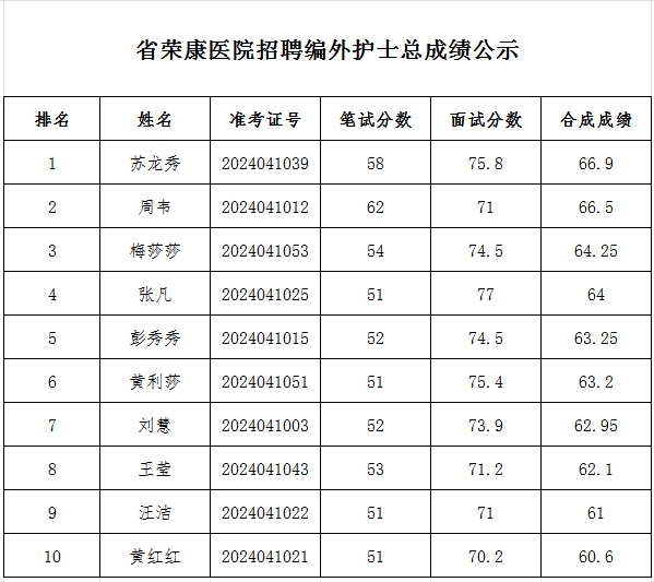 根据我院2024年招聘编外护士工作安排,经过报名、资格审查、笔试、面试等程序,现将总成绩公布如下,后续体检等有关事项另行通知。