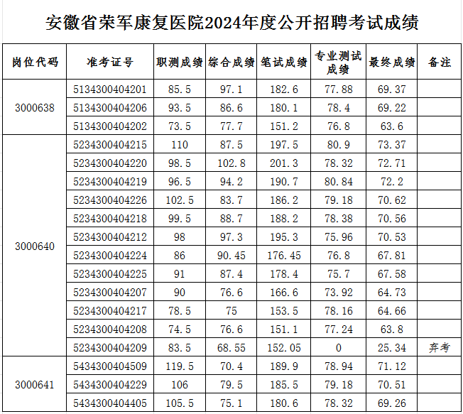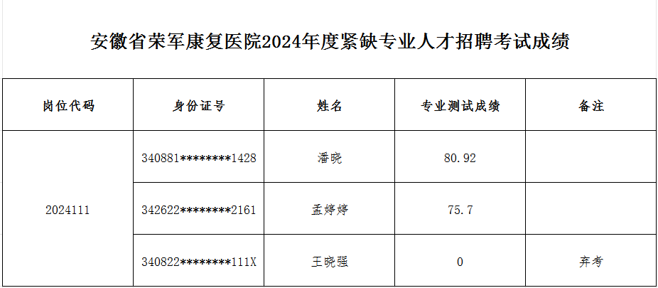 关于2024年度安徽省荣军康复医院公开招聘和紧缺专业人才招聘考试成绩的公告