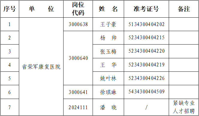 根据《2024年度安徽省省直事业单位公开招聘人员实施方案》《2024年度安徽省荣军康复医院紧缺专业人才招聘公告》,现将我院拟聘用人员名单进行公示(名单见附件)。公示时间为7天(2024年7月18日—2024年7月24日),对拟聘用人员如有不同意见,请在公示期内以电话或书面方式向省退役军人事务厅机关纪委或省荣康医院纪委反映。监督电话:0551-65602967 0556-5631007