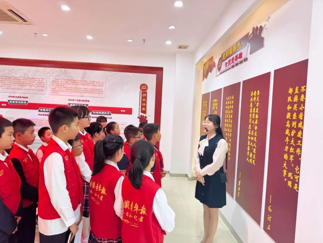活动当天,一踏入展陈馆的大门,一面鲜红的党旗映入眼帘,学生记者们便被这庄严的氛围深深震撼,大家在党旗下驻足,心中不禁涌起一股莫名的激动与敬仰。在讲解员余锦阿姨的引领下,学生记者们开始了今天的红色探索之旅。