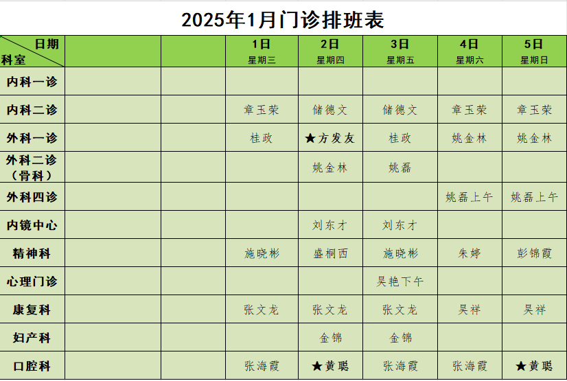 2025年1月门诊排班表