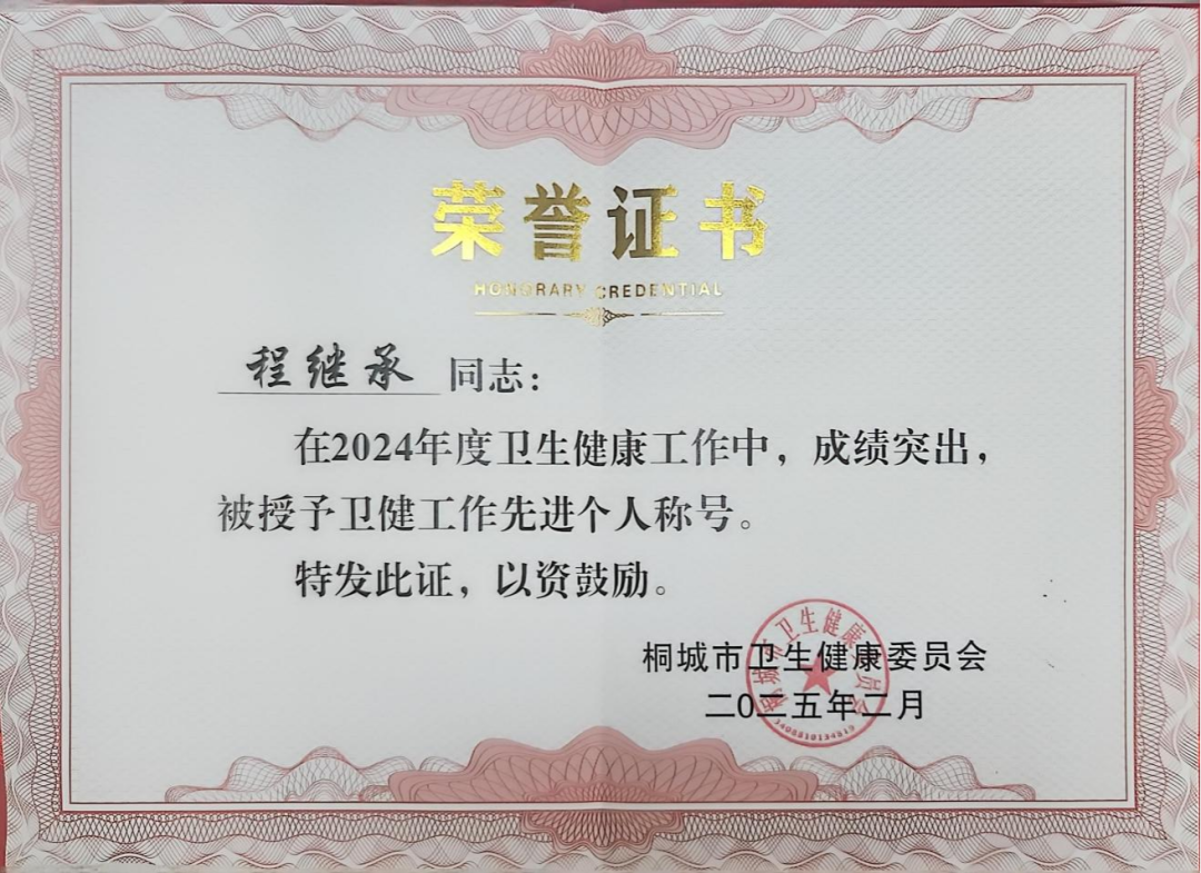 喜报!我院程继承、方清2名同志荣获桐城市卫生健康工作先进个人称号