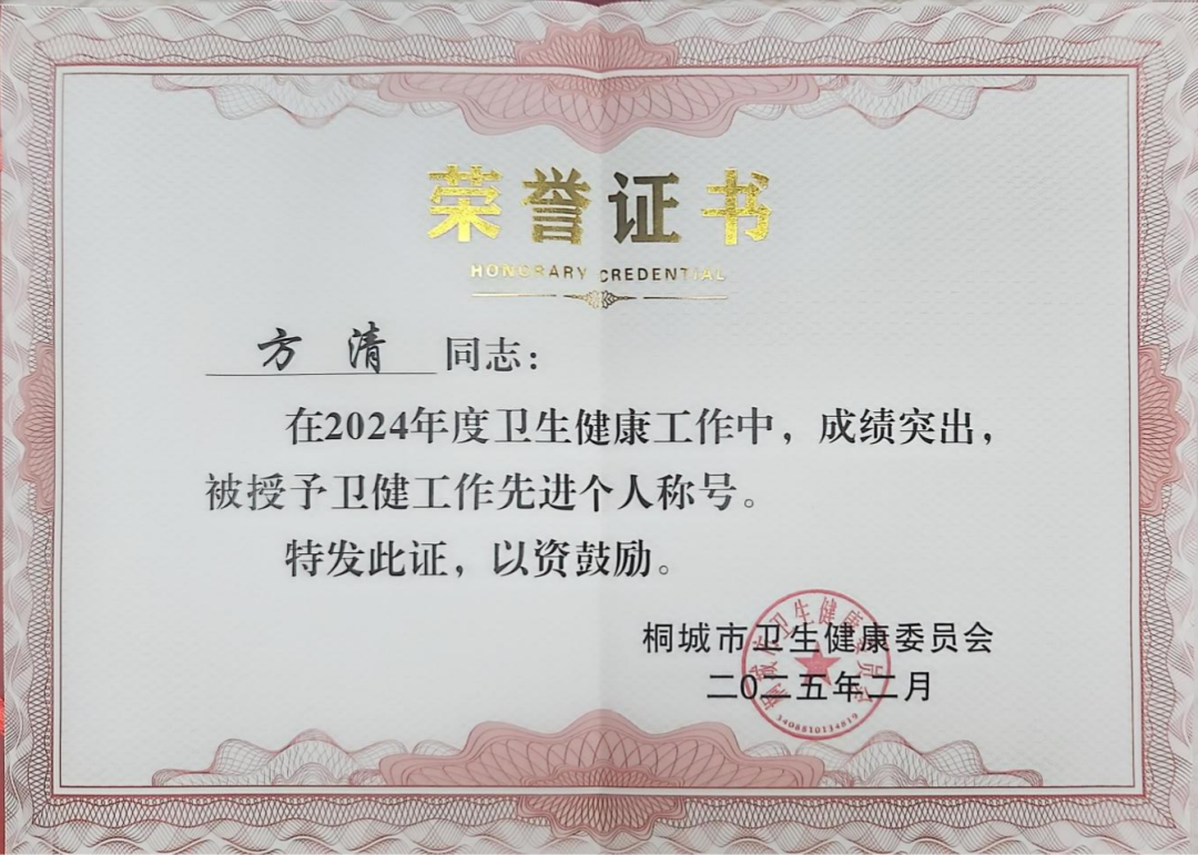 程继承、方清2名同志荣获桐城市卫健工作先进个人称号,为全院树立了榜样,激励全体职工再创佳绩,为卫生健康事业贡献更大力量。