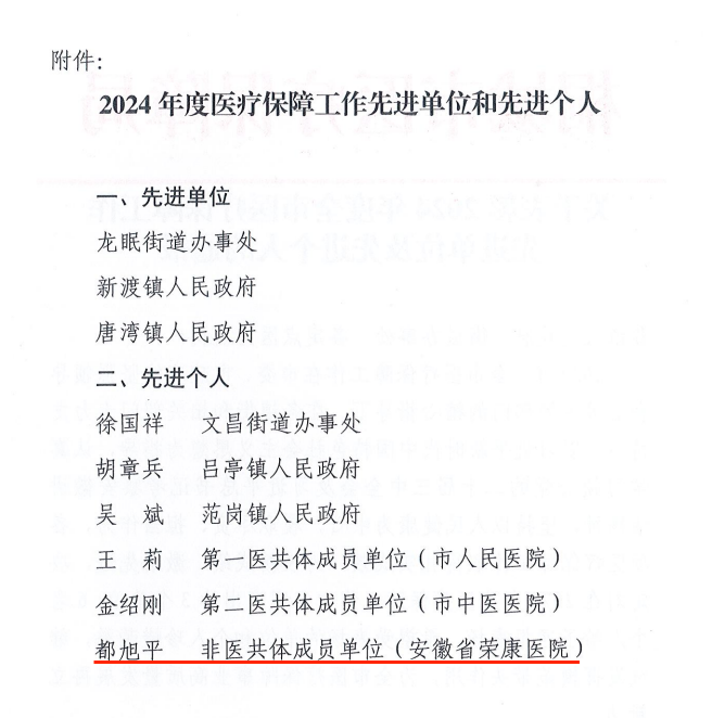 近日,为表扬成绩、激励先进,桐城市医疗保障局对在2024年度医疗保障工作中表现突出的单位和个人给予通报表扬,我院都旭平同志被授予“医疗保障工作先进个人”荣誉称号。