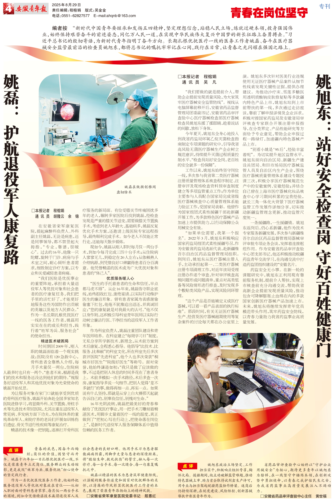 “我们医院是优抚事业的重要阵地,承担着大量退役军人等优抚对象和社会患者的医疗康复任务,我们把手里的活忙好了,才能更好地服务这些为国防作出贡献的英雄以及地方人民群众。”作为一名长期扎根优抚医疗一线的医务工作者,姚磊用实实在在的成长和担当,践行着“姓军为兵、服务社会”的使命担当。
