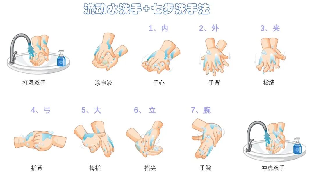 如何洗:使用流动水+肥皂/洗手液,按照“七步洗手法”搓洗至少15秒。无洗手条件时,可用含酒精的免洗手消毒液替代。